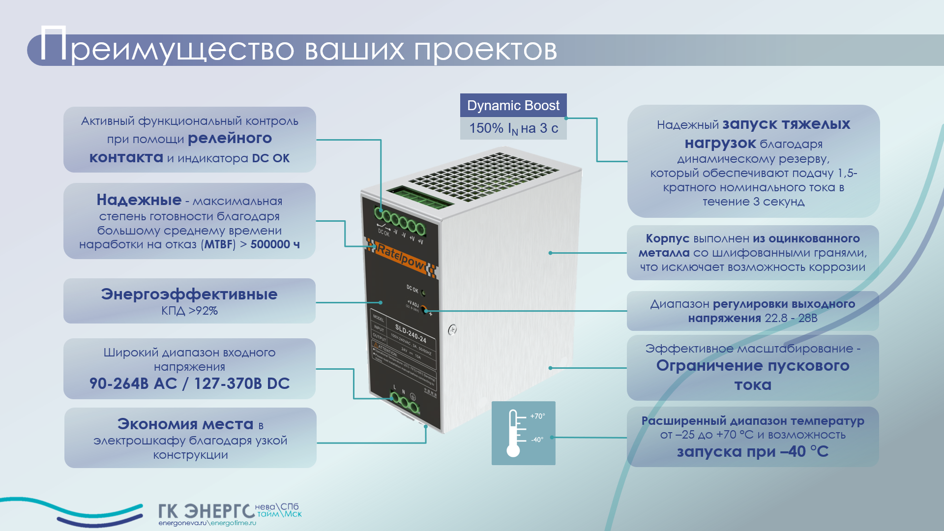 • Номинальное напряжение: 24В, диапазон выходного напряжения: 24-28В